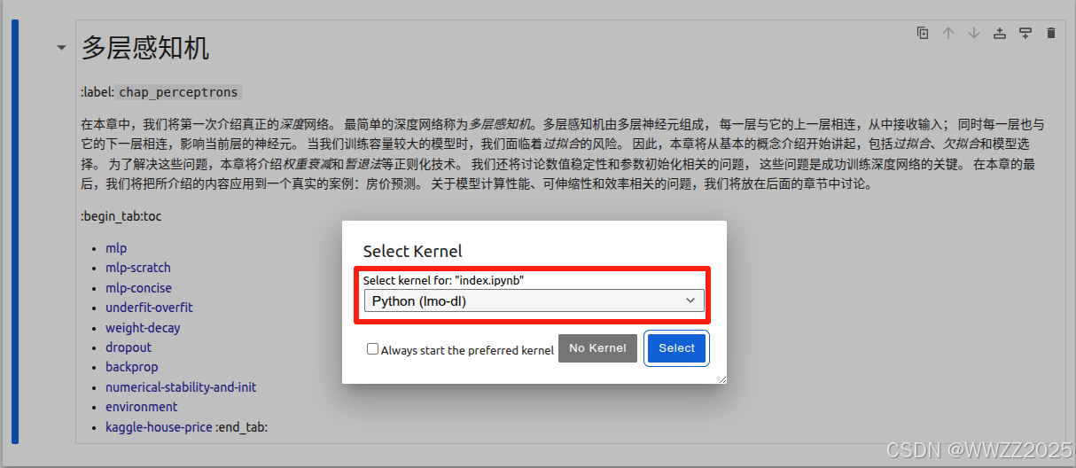 #将当前注册为Jupyter kernel conda activate lmo-dl conda install ipykernel python -m ipykernel install --user --name lmo-dl --display-name "Python (lmo-dl)"#打开jupyter notebook cd ~/pytorch jupyter notebook