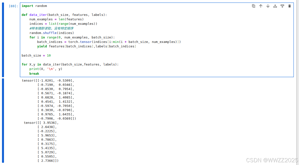 import randomdef data_iter(batch_size, features, labels):num_examples = len(features)indices = list(range(num_examples))#样本随即读取,没有特定顺序random.shuffle(indices)for i in range(0, num_examples, batch_size):batch_indices = torch.tensor(indices[i:min(i + batch_size, num_examples)])yield features[batch_indices],labels[batch_indices]batch_size = 10for X,y in data_iter(batch_size,features, labels):print(X, '\n', y)break