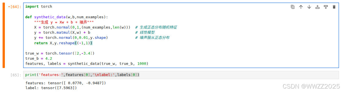 import torchdef synthetic_data(w,b,num_examples):"""生成 y = Xw + b + 噪声"""X = torch.normal(0,1,(num_examples,len(w))) # 生成正态分布随机特征y = torch.matmul(X,w) + b # 线性模型y += torch.normal(0,0.01,y.shape) # 噪声服从正态分布return X,y.reshape((-1,1))true_w = torch.tensor([2,-3.4]) true_b = 4.2 features, labels = synthetic_data(true_w, true_b, 1000)