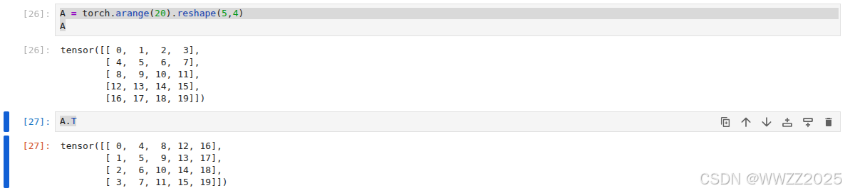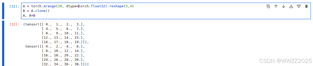 A = torch.arange(20, dtype=torch.float32).reshape(5,4) B = A.clone() A, A+B