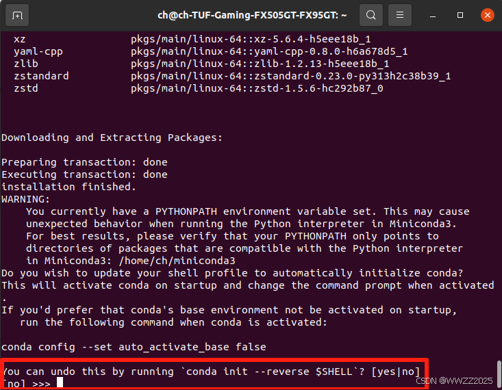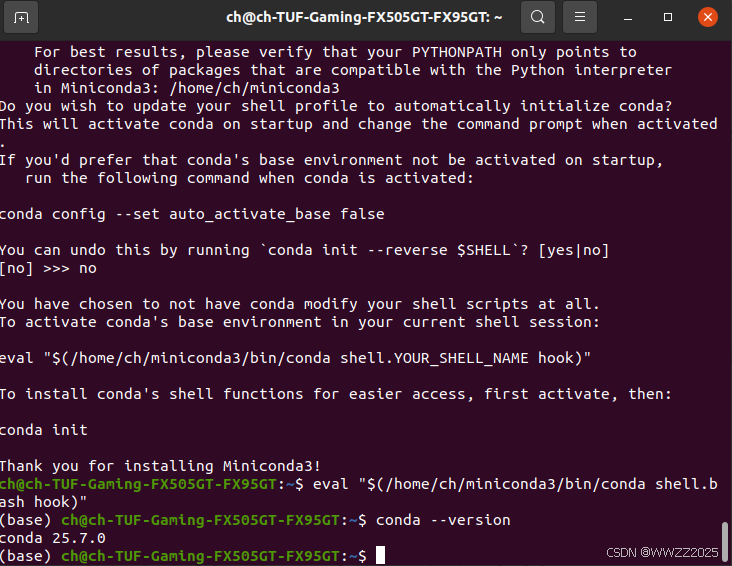 (2)选择是否开机时自启动miniconda,此处都行,看个人习惯,博主选择no,后续启动miniconda命令如下,注意修改为自己的路径: