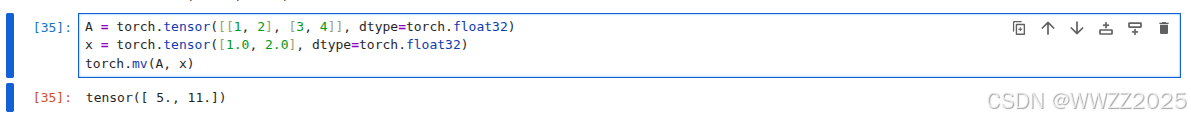 A = torch.tensor([[1, 2], [3, 4]], dtype=torch.float32) x = torch.tensor([1.0, 2.0], dtype=torch.float32) torch.mv(A, x)