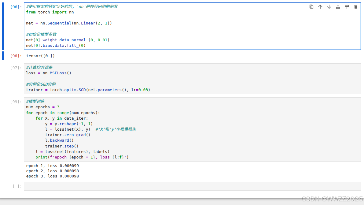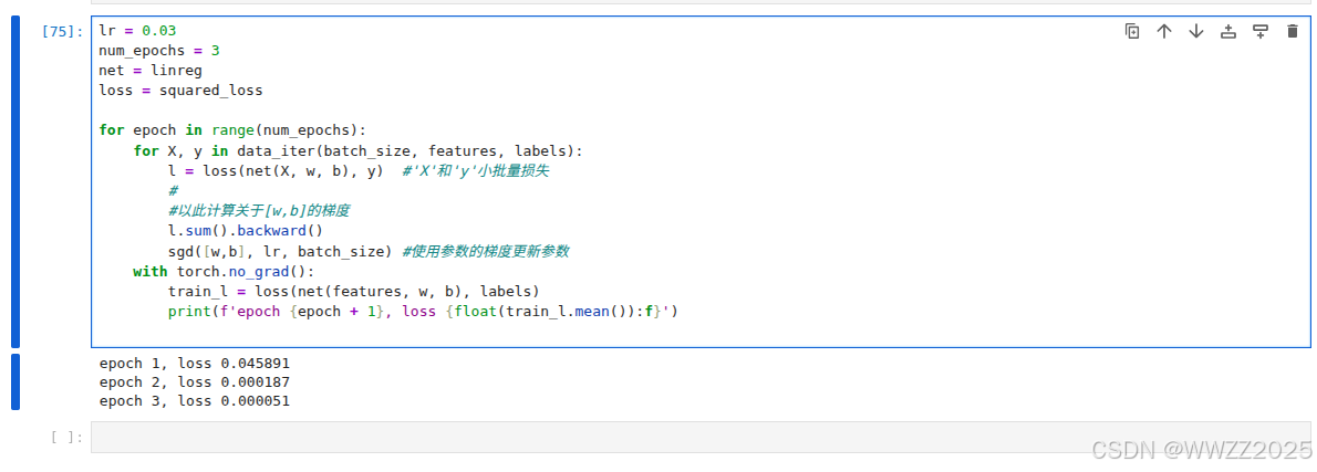 lr = 0.03 num_epochs = 3 net = linreg loss = squared_lossfor epoch in range(num_epochs):for X, y in data_iter(batch_size, features, labels):l = loss(net(X, w, b), y) #'X'和'y'小批量损失##以此计算关于[w,b]的梯度l.sum().backward()sgd([w,b], lr, batch_size) #使用参数的梯度更新参数with torch.no_grad():train_l = loss(net(features, w, b), labels)print(f'epoch {epoch + 1}, loss {float(train_l.mean()):f}')