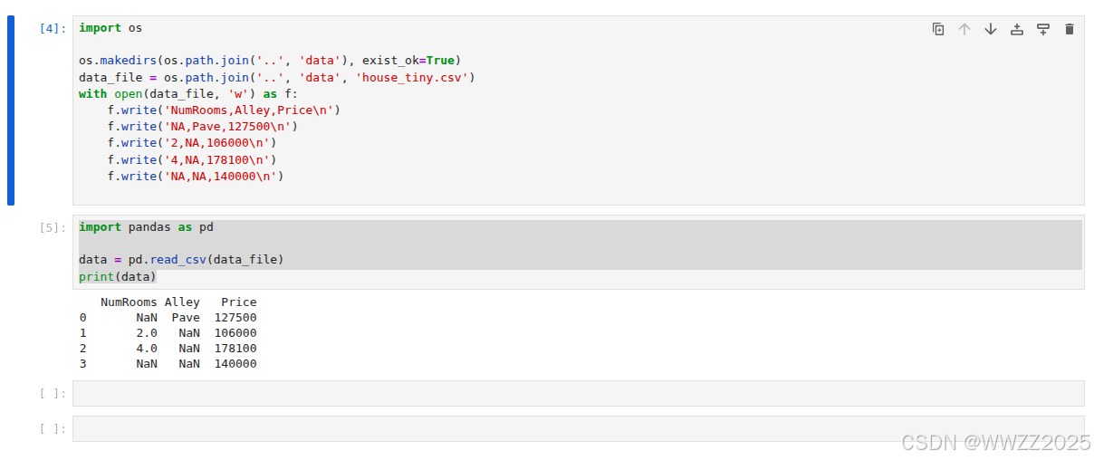 import osos.makedirs(os.path.join('..','data'),exist_ok=True) data_file = os.path.join('..','data', 'house_tiny.csv') with open(data_file, 'w') as f:f.write('NumRooms,Alley,Price\n') #列名f.write('NA,Pave,127500\n') #每行表示一个样本数据f.write('2,NA,106000\n')f.write('4,NA,178100\n')f.write('NA,NA,140000\n')从创建的csv文件中加载原始数据集