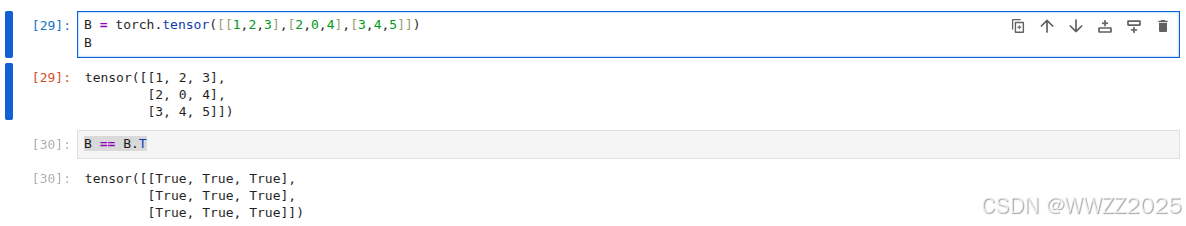 B = torch.tensor([[1,2,3],[2,0,4],[3,4,5]]) BB == B.T