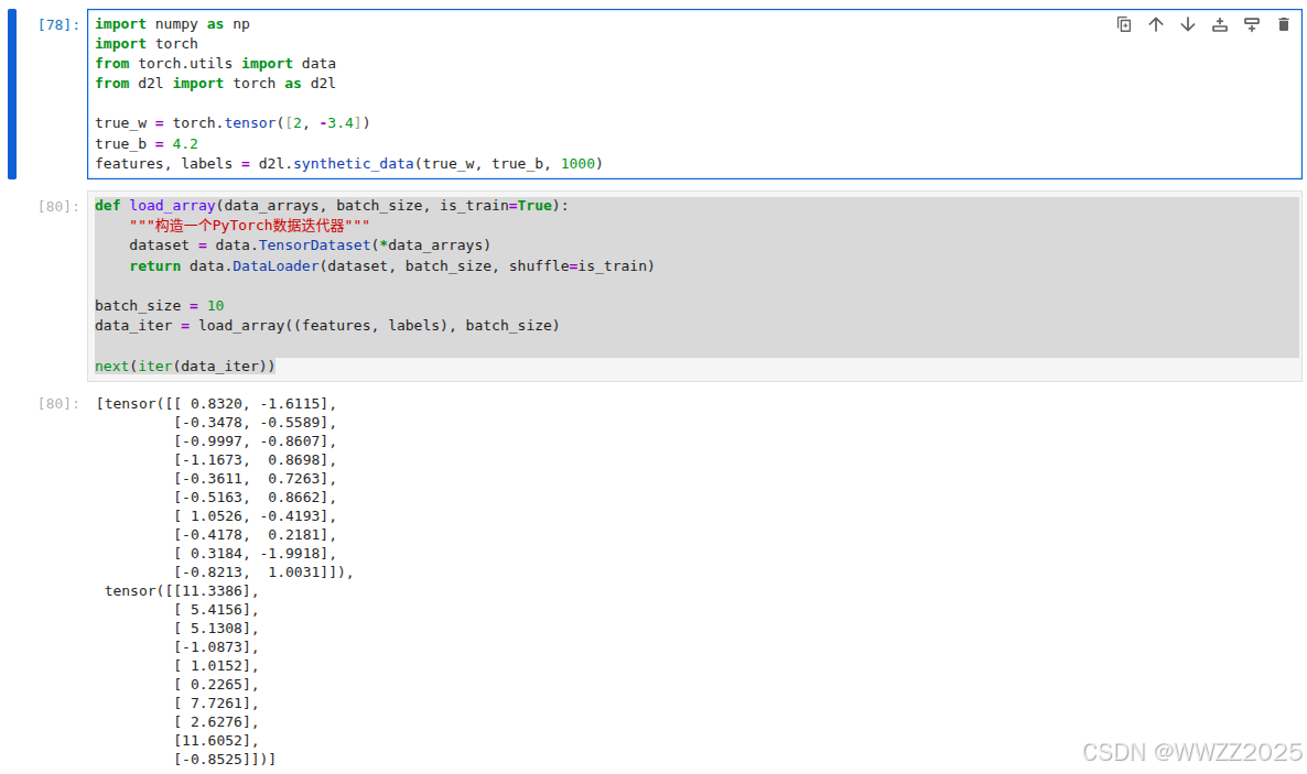 import numpy as np import torch from torch.utils import data from d2l import torch as d2ltrue_w = torch.tensor([2, -3.4]) true_b = 4.2 features, labels = d2l.synthetic_data(true_w, true_b, 1000)def load_array(data_arrays, batch_size, is_train=True):"""构造一个PyTorch数据迭代器"""dataset = data.TensorDataset(*data_arrays)return data.DataLoader(dataset, batch_size, shuffle=is_train)batch_size = 10 data_iter = load_array((features, labels), batch_size)next(iter(data_iter))#使用框架的预定义好的层,'nn'是神经网络的缩写 from torch import nnnet = nn.Sequential(nn,Linear(2, 1))#初始化模型参数 net[0].weight.data.normal_(0, 0.01) net[0].bias.data.fill_(0)#计算均方误差 loss = nn.MSELoss()#实例化SGD实例 trainer = torch.optim.SGD(net.parameters(), lr=0.03)#模型训练 num_epochs = 3 for epoch in range(num_epochs):for X, y in data_iter:l = loss(net(X), y) #'X'和'y'小批量损失trainer.zero_grad()l.backward()trainer.step()l = loss(net(features), labels)print(f'epoch {epoch + 1}, loss {l:f}')