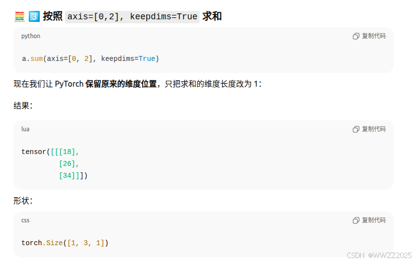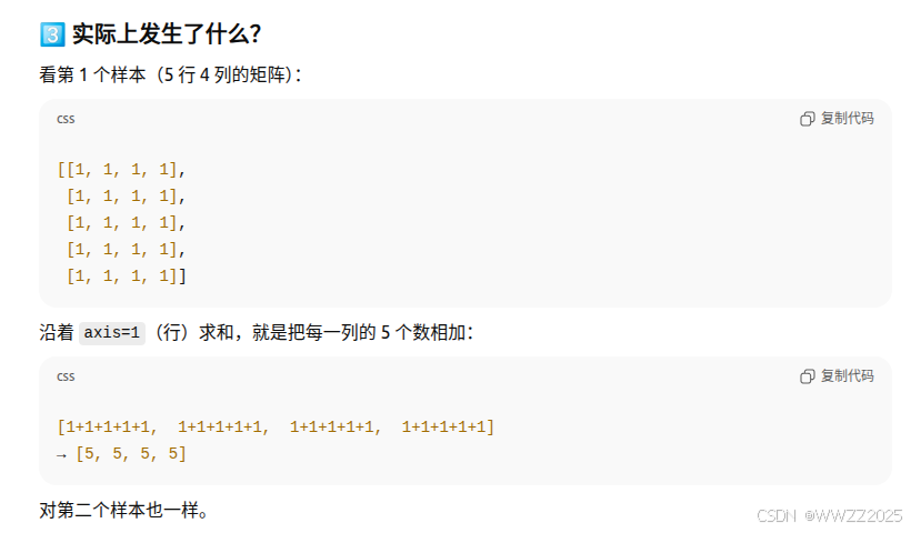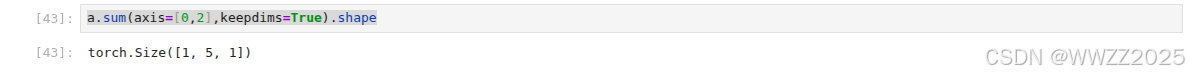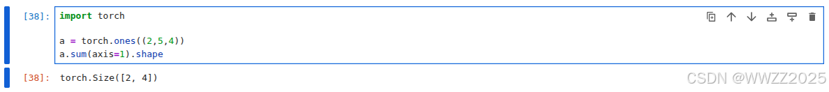 import torcha = torch.ones((2,5,4)) a.sum(axis=1).shape