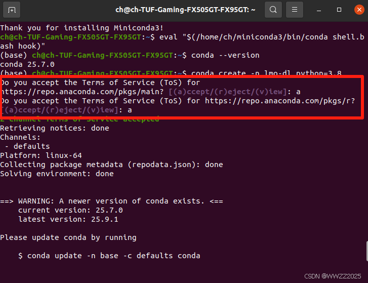 # 创建隔离环境 conda create -n lmo-dl python=3.8# 激活环境 conda activate lmo-dl(1)全部接受,a+回车,后面yes
