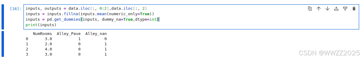 inputs, outputs = data.iloc[:, 0:2],data.iloc[:, 2] inputs = inputs.fillna(inputs.mean(numeric_only=True)) inputs = pd.get_dummies(inputs, dummy_na=True,dtype=int) print(inputs)