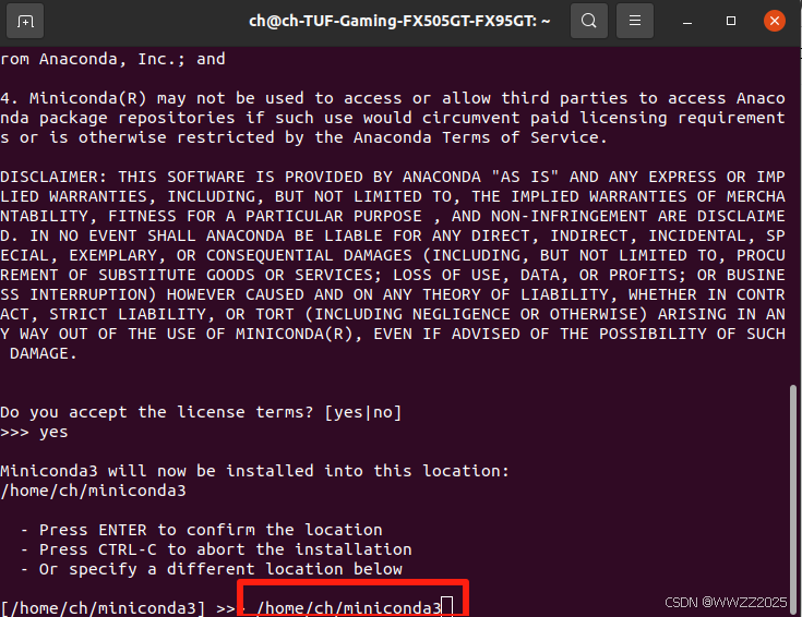 #下载miniconda wget https://repo.anaconda.com/miniconda/Miniconda3-latest-Linux-x86_64.sh #运行安装脚本 bash Miniconda3-latest-Linux-x86_64.sh(1)回车+yes,选择安装路径: