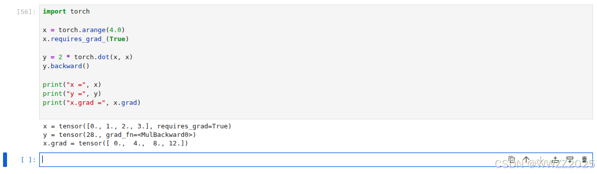 import torchx = torch.arange(4.0) x.requires_grad_(True)y = 2 * torch.dot(x, x) y.backward()print("x =", x) print("y =", y) print("x.grad =", x.grad)