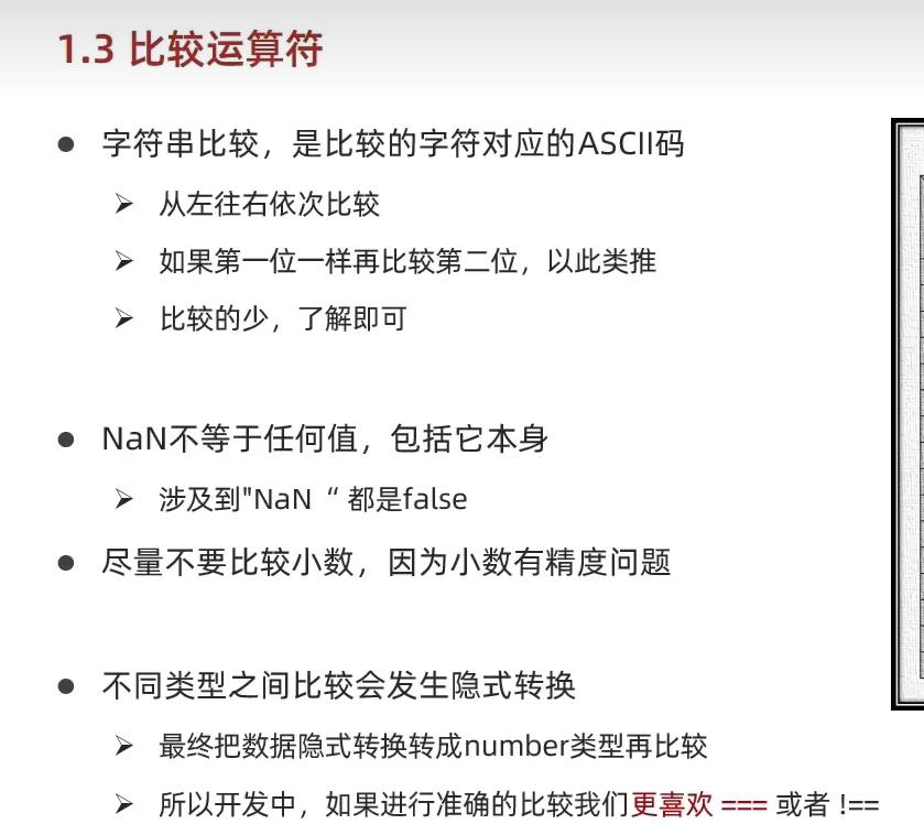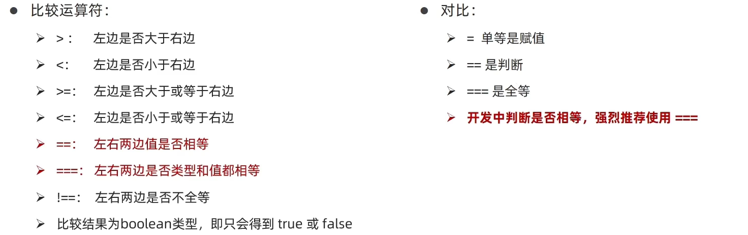 1.比较运算符也有隐士转换,将字符转换为数字【针对双等】;以后判断两个值是否相等:开发用的较多的是三等===
