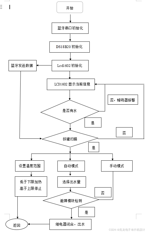 { delay_init(); //延时函数初始化 delay_ms(500); //上电瞬间加入一定延时在初始化STM32_FlashCheck();DS18B20_GPIO_Init(); //ds18b20引脚初始化DS18B20_Init(); //初始化DS18B20uart1_Init(9600);KEY_AND_RELAY_GPIO_Init();LCD_Init(); //屏幕初始化LCD_Write_String(0,0,"Temperature: C");LCD_Write_String(0,1,"Volume: 200ml ");LED1 = 1;Mode = 0;//自动模式miao=openTime;memset(STM32_RX1_BUF,0,STM32_RX1BUFF_SIZE);STM32_Rx1Counter = 0;TIM3_Init(499,7199); //定时器初始化,定时50ms//Tout = ((arr+1)*(psc+1))/Tclk ; //Tclk:定时器输入频率(单位MHZ)//Tout:定时器溢出时间(单位us)while(1){ keyscan();if(setn ==0){///////显示温度LCD_Write_Char(13,0,temperature/10+48);LCD_Write_Char(14,0,temperature%10+48);if(closeFlag==1)//关闭出水继电器{closeFlag = 0;openFlag = 0;chushui(0);}if(shuiwei == 1)//有水{beep = 0;if(temperature <= temp_low){relay1=1;}//低于下限开启加热继电器if(temperature >= temp_hight){relay1=0;}//高于上限停止if(Mode == 0)//在自动模式下{if(key5 == 0 && HW==0)//出水按键,必须在检测到有杯子的情况下才有效{delay_ms(10);if(key5 == 0 && HW==0){while(key5 == 0);//等待按键松开chushui(1);//显示Openmiao=openTime;//时间赋值openFlag = 1;}}}else//在手动模式下{if(key5 == 0&& HW==0)//出水按键,必须在检测到有杯子的情况下才有效{delay_ms(10);if(key5 == 0){chushui(1);test=0;}}else {if(test==0)chushui(0);}if(HW==1){chushui(0);test=0;}}}else{relay1 = 0;//没有水关闭加热继电器relay2=0;//关闭出水继电器ssflag = 0;beep = 1;//蜂鸣器提示报警if(Twinkle == 0)LCD_Write_String(0,1," Without Water! ");elseLCD_Write_String(0,1," ");}}delay_ms(10);}