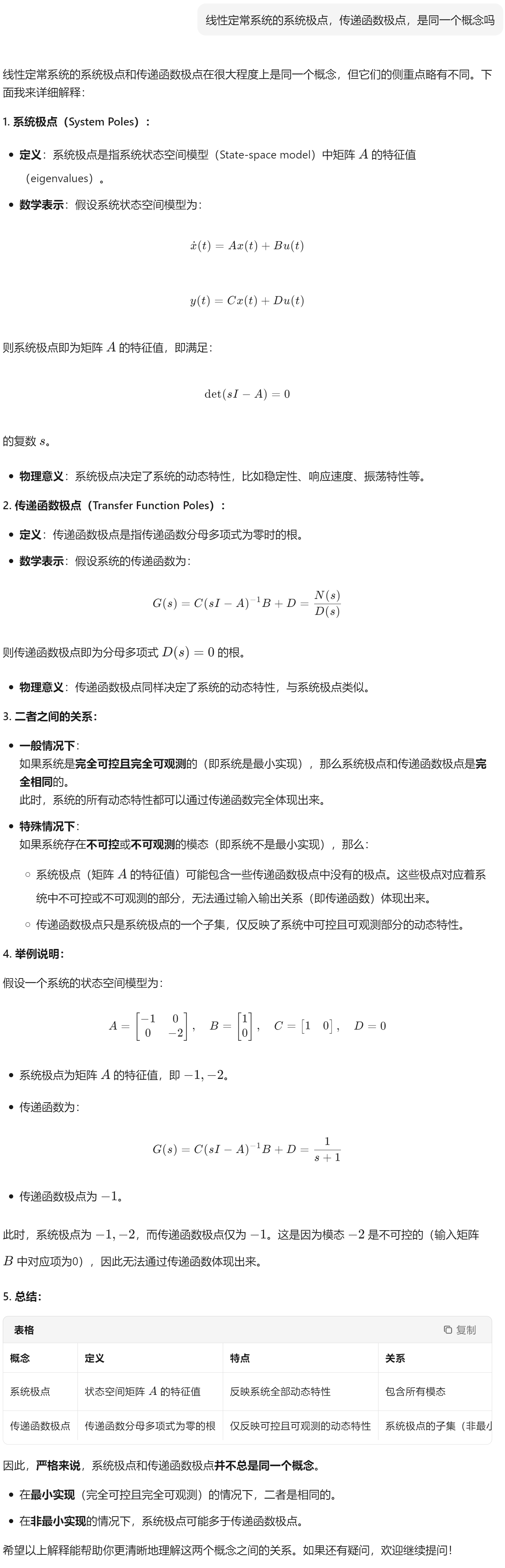 - 当重极点对应多个约当块时,则系统的特征多项式与最小多项式不同,后者的次数低于前者的次数1,表中系统2就属于这一类型,其极点为重根