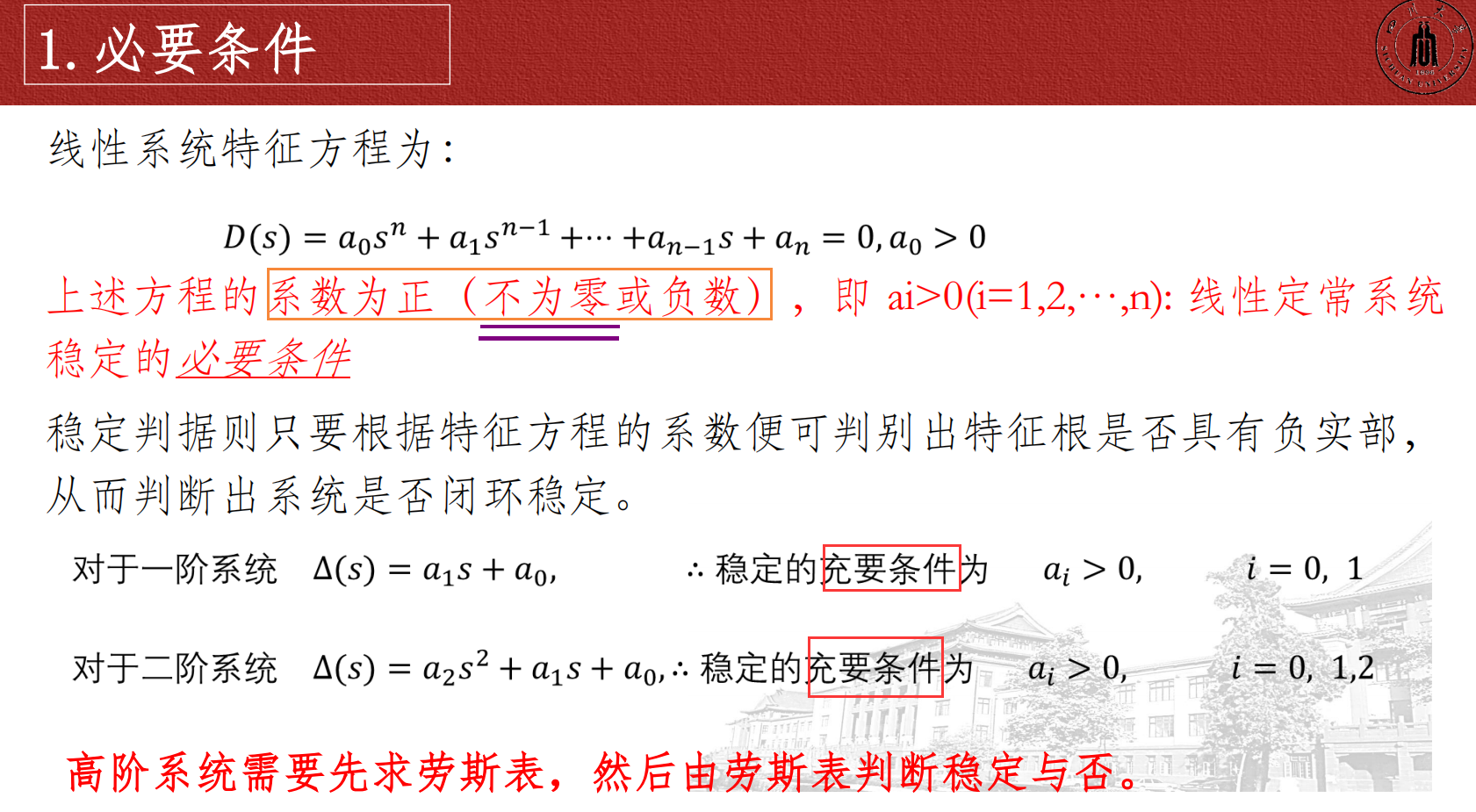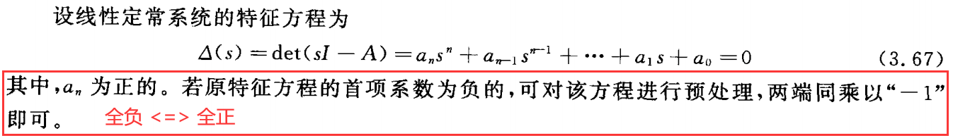 故可得线性定常系统稳定的必要条件是,特征方程的所有系数均为正的(或系数同号)。