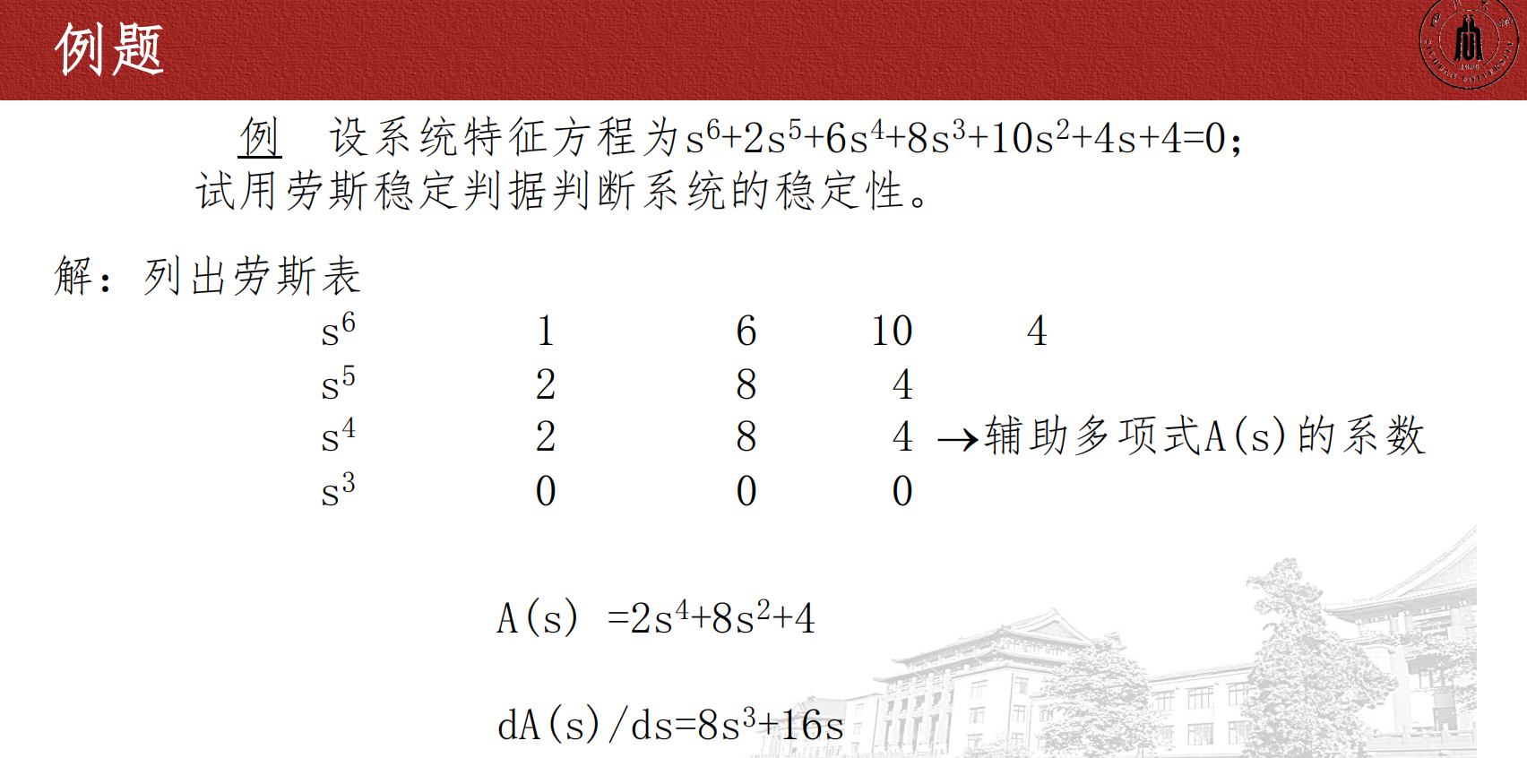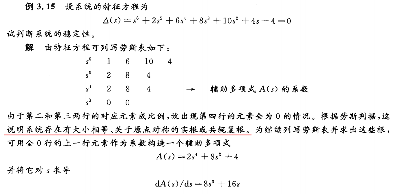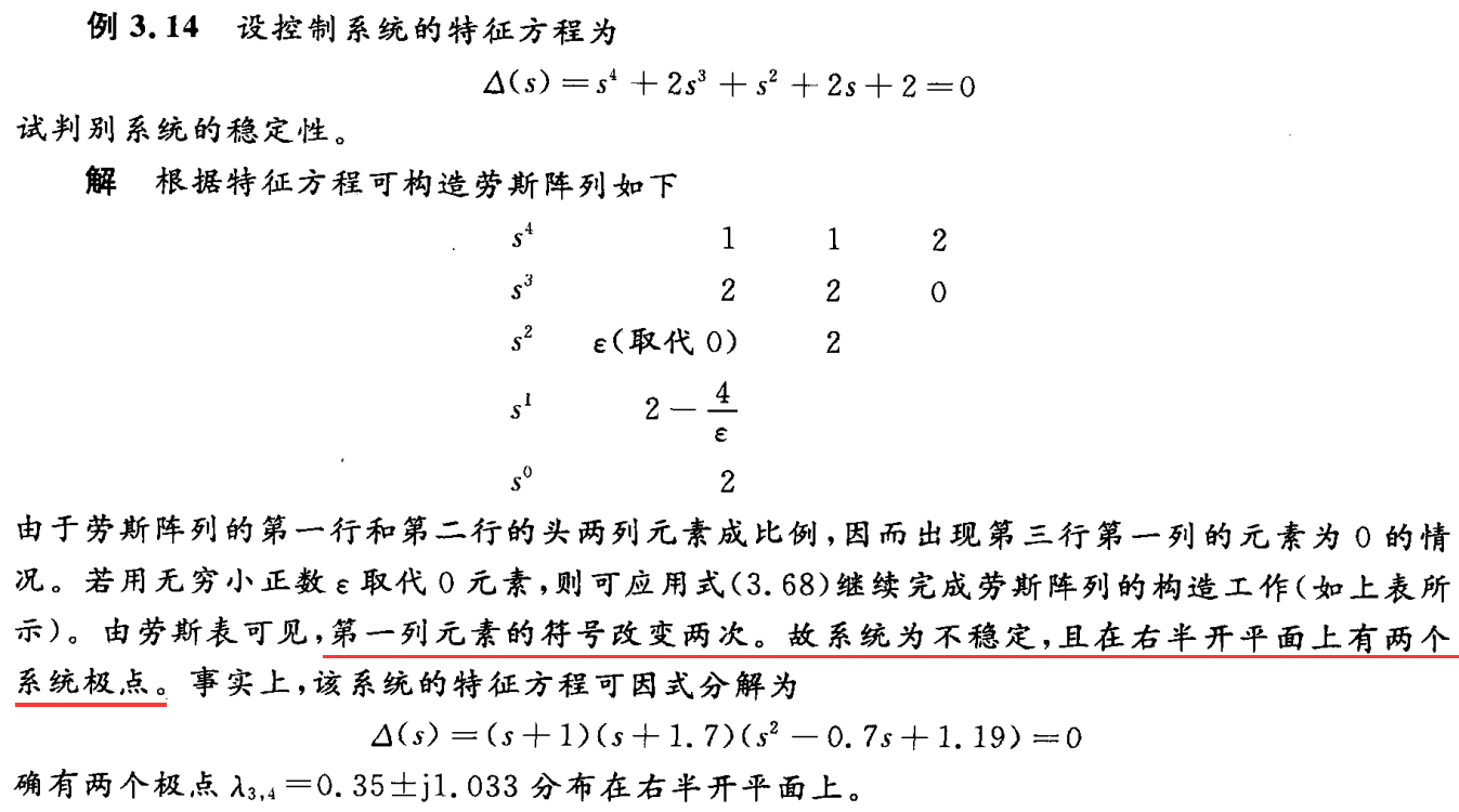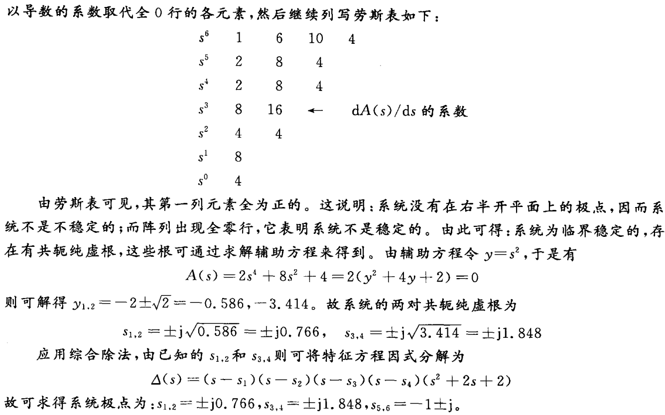 由于0元素存在,使得式(3.68)难以应用,必须处理后才能完成劳斯表的构造工作。