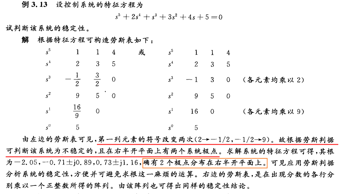由于劳斯判据是根据元素的符号进行判断的,故为了简化运算可用一个正整数去除(或乘)阵列某一行的各元素,并不改变稳定性的结论。