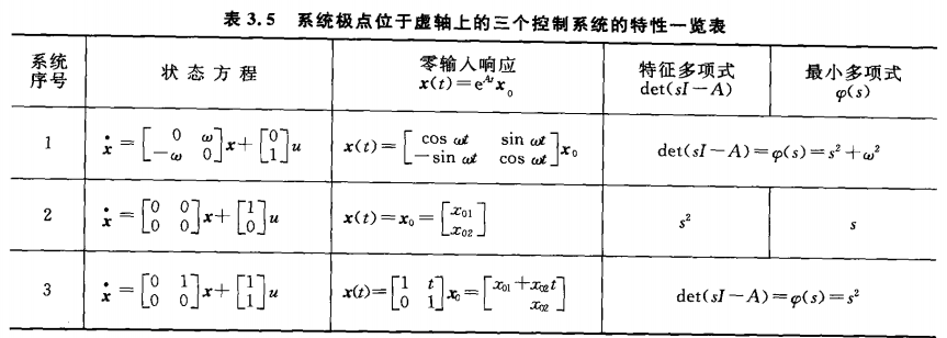 ,于,则由式(3.18)可分别求得各系统状态的零输入响应以及特征多项式和最小多项式如表中所列。