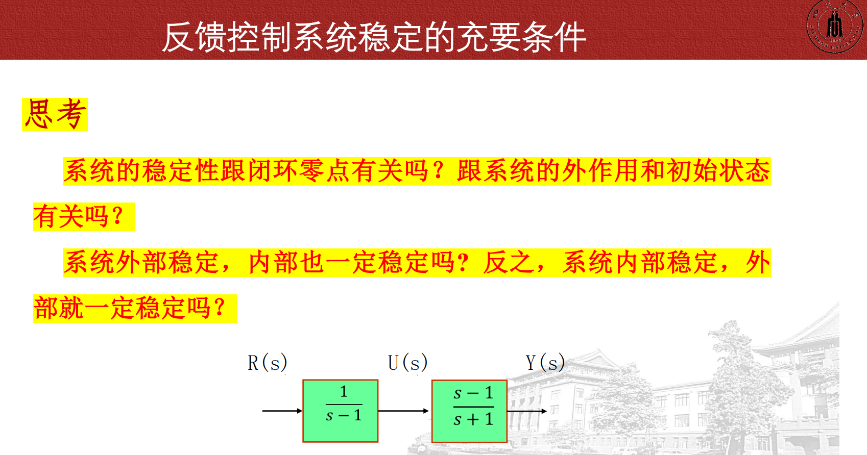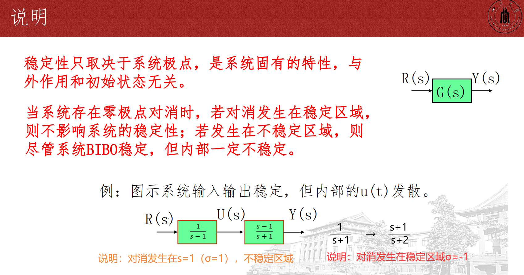- 但如果系统是BIBO稳定的,则未必也是内部稳定的,要看零极相消时所对消的系统极点是稳定的(分布在S的左半开平面上),还是不稳定的(分布在S的右半闭平面上)而定: