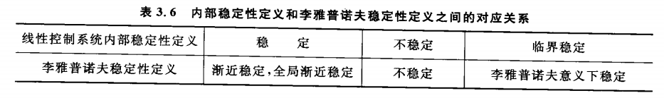 内部稳定性定义和李雅普诺夫稳定性定义之间的对应关系如表3.6所列。