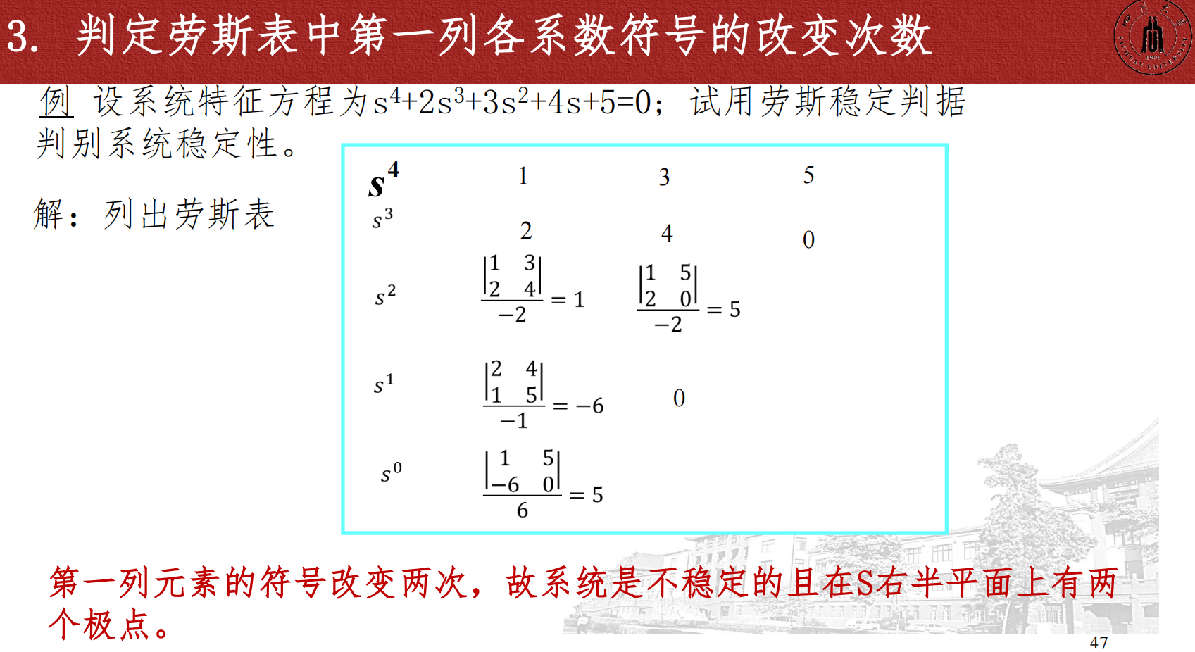 - (2)若劳斯表第一列的元素出现负的,则系统为不稳定。而且分布在右半开平面上系统极点的个数,就等于第一列元素符号改变的次数。