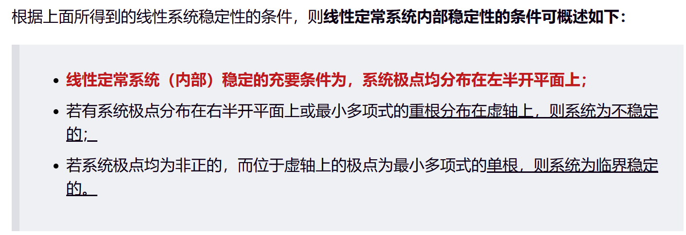 - 若有系统极点分布在右半开平面上或最小多项式的重根分布在虚轴上,则系统为不稳定的;