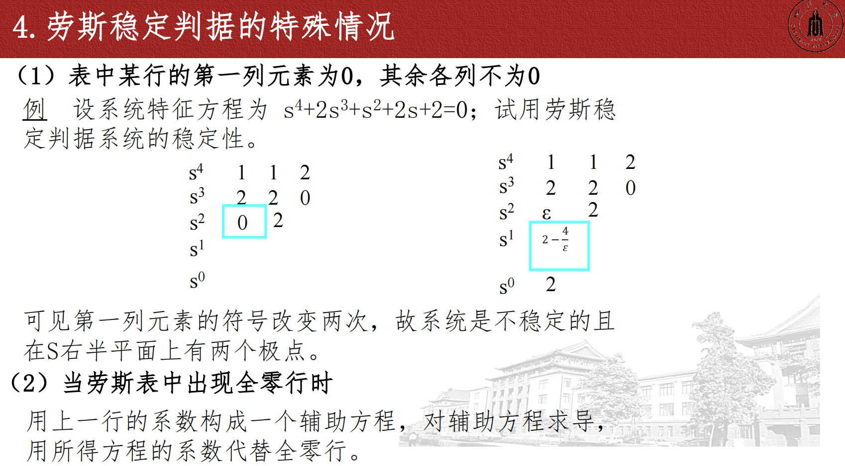 - (3)若劳斯表的第一列出现0元素,肯定系统不是稳定的。究竟是不稳定还是临界稳定的,还需根据劳斯表作进一步判断。
