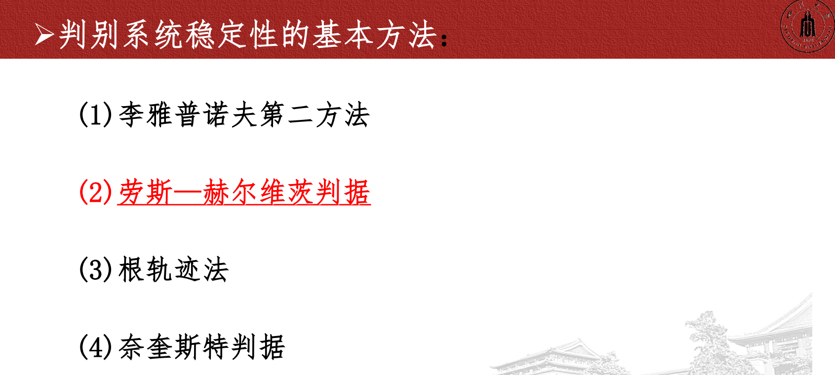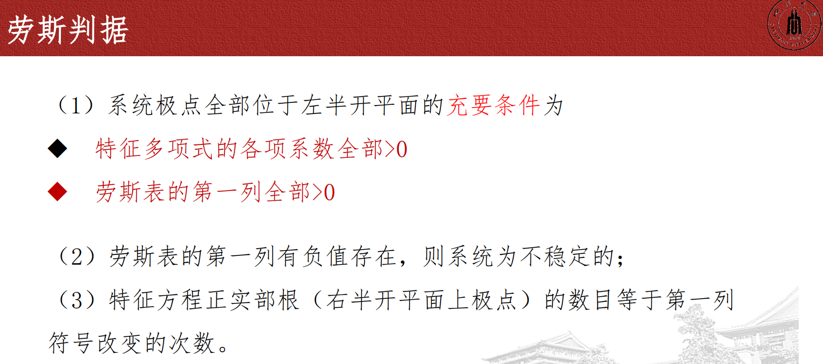 - (1)线性定常系统稳定(即所有系统极点均具有负实部)的充分必要条件为,劳斯表第一列的所有元素全为正的。