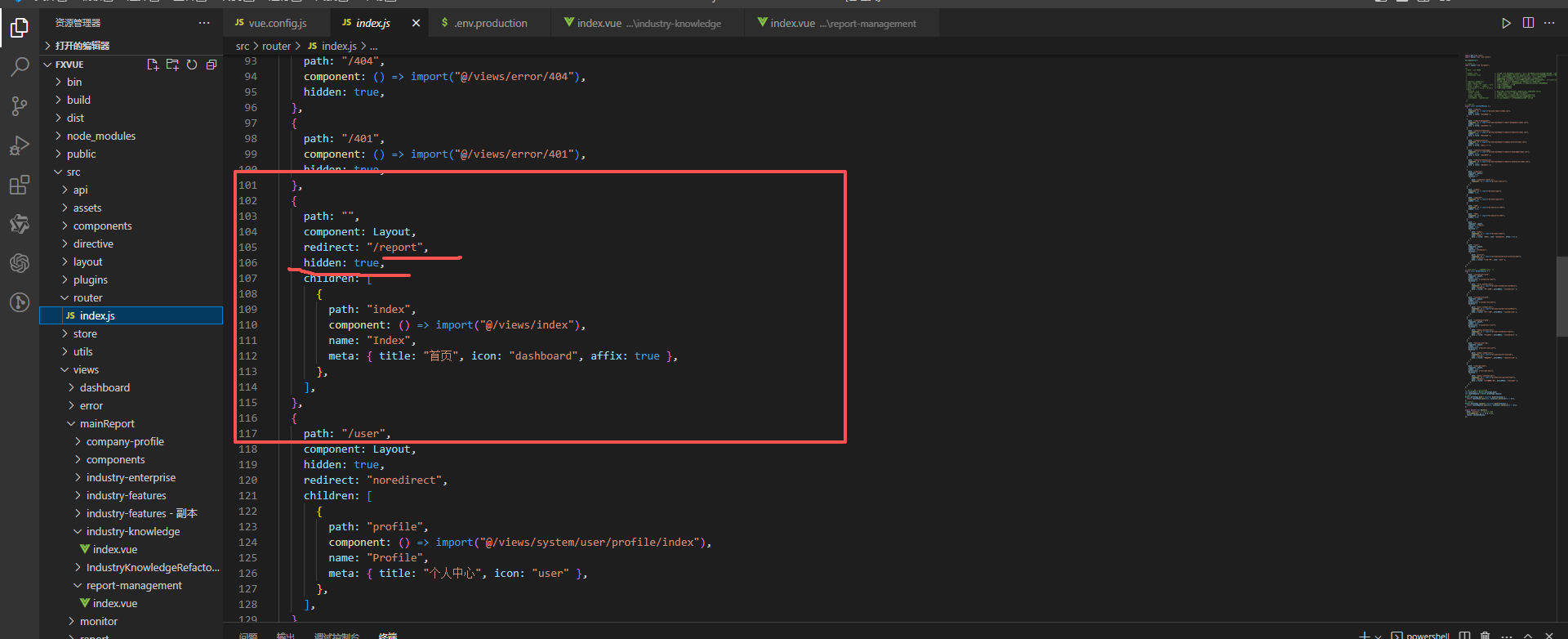 handleLogin() {this.$refs.loginForm.validate(valid => {if (valid) {this.loading = trueif (this.loginForm.rememberMe) {Cookies.set("username", this.loginForm.username, { expires: 30 })Cookies.set("password", encrypt(this.loginForm.password), { expires: 30 })Cookies.set('rememberMe', this.loginForm.rememberMe, { expires: 30 })} else {Cookies.remove("username")Cookies.remove("password")Cookies.remove('rememberMe')}this.$store.dispatch("Login", this.loginForm).then(() => {// this.$router.push({ path: this.redirect || "/" }).catch(()=>{})this.$router.push({ path:"/attractingInvestmen/EnterpriseWarehouse" }).catch(()=>{})}).catch(() => {this.loading = falseif (this.captchaEnabled) {this.getCode()}})}})}2.修改首页路由为隐藏,router/index.js中,并改重定向路由