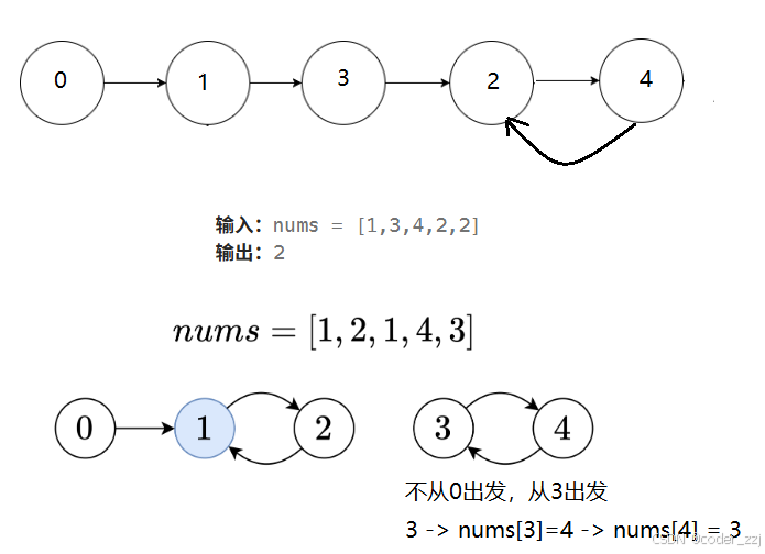从入度为0的起点(这才保证一定能找到),也就是下标为0的节点开始,往后走,这里 next 翻译为 nums[0]