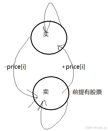 public:int maxProfit(vector<int> &prices){int n = prices.size();vector<int> dp_buy(n), dp_sale(n);dp_buy[0] = -prices[0];for (int i = 1; i < n; i++){dp_buy[i] = max(dp_buy[i - 1], dp_sale[i - 1] - prices[i]);dp_sale[i] = max(dp_sale[i - 1], dp_buy[i - 1] + prices[i]);}return max(dp_buy[n - 1], dp_sale[n - 1]);}