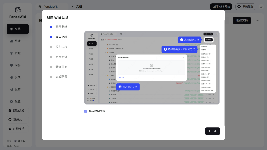 详见:https://pandawiki.docs.baizhi.cloud/node/01971af3-f304-7043-9e39-d2c6b6f8d4e9