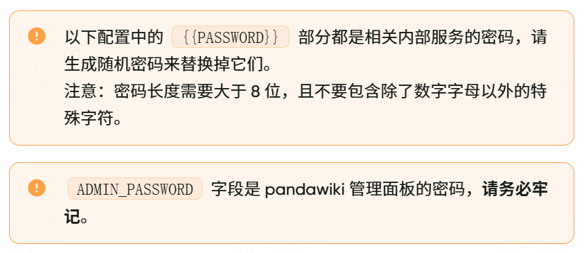 # 因为当前为测试环境,所以都修改成相同密码sed -i 's/{{PASSWORD}}/pandawiki/g' .env