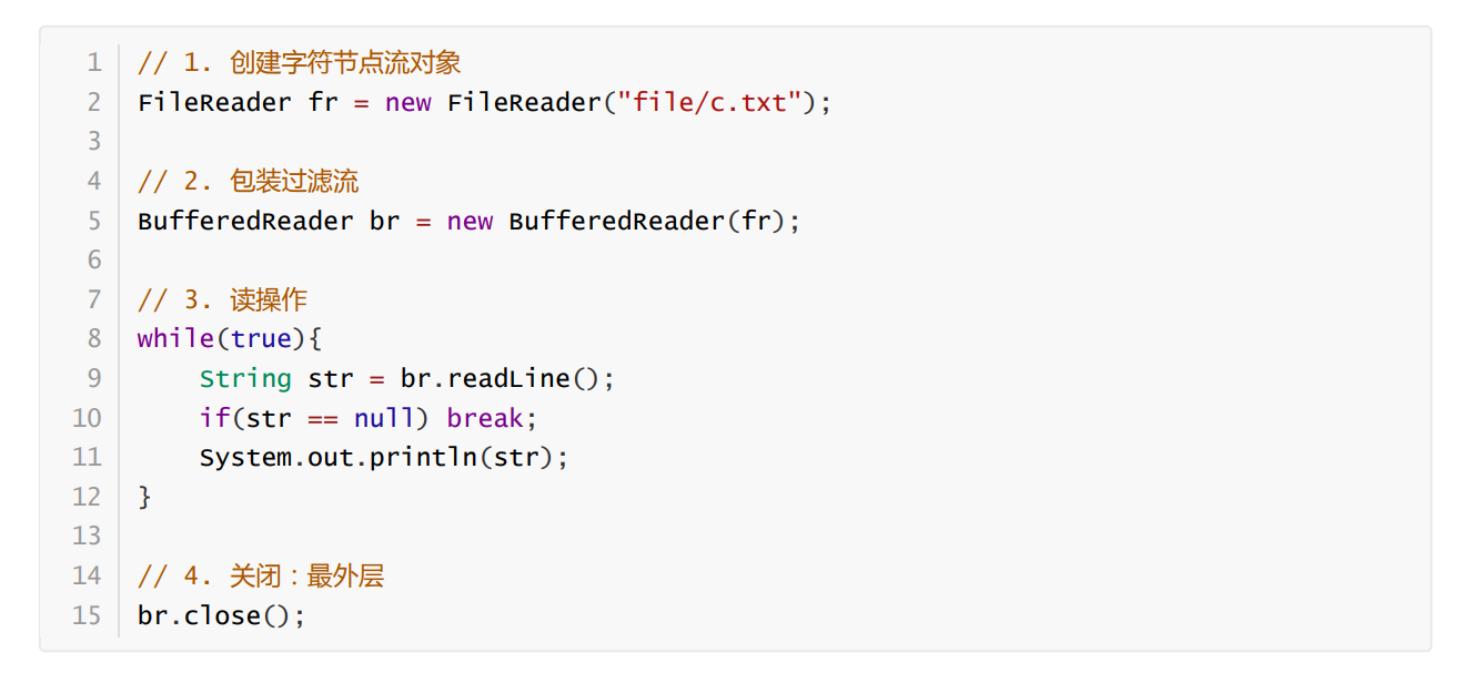 (1) BufferedReader : 常用方法:String readLine() : 一次性读取一个文本行,如果达到文件的尾部,则返回null。