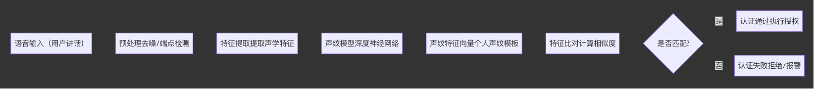 声纹识别的过程包含几个关键步骤,我们可以用流程图来描述其工作原理: