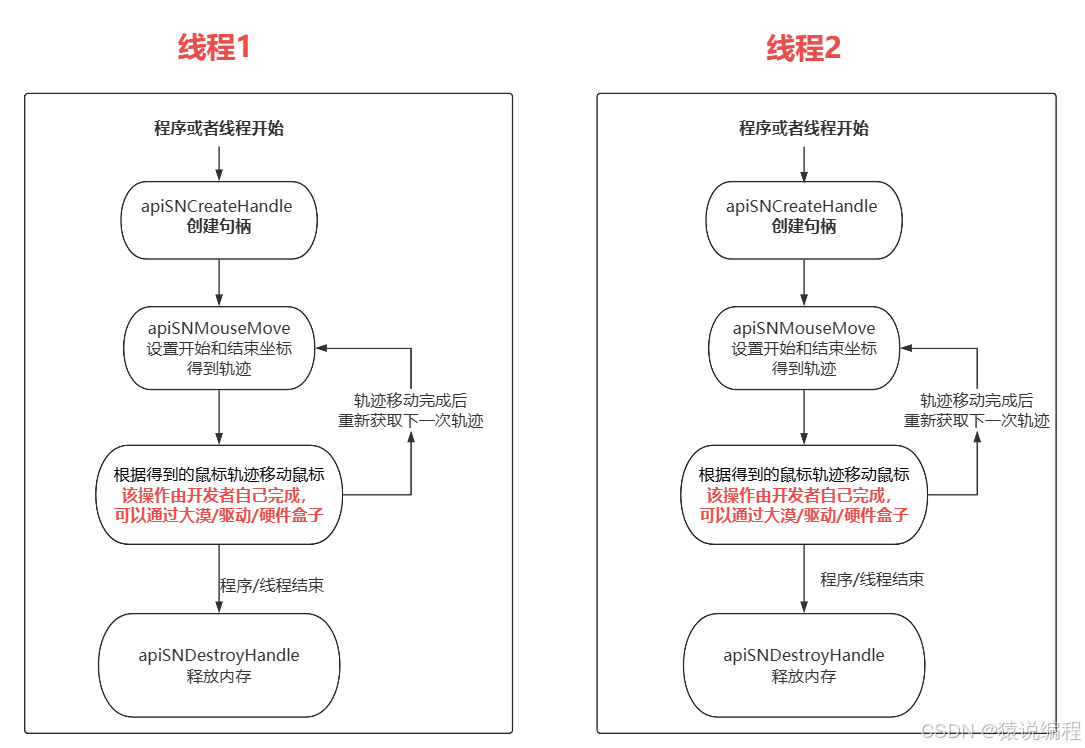 参考前面的《2.鼠标轨迹API调用流程图》,多线程和单线程类似;如果是多线程,那么每个线程都需要通过apiSNCreateHandle创建HANDLE句柄,这样才能多个线程互不影响