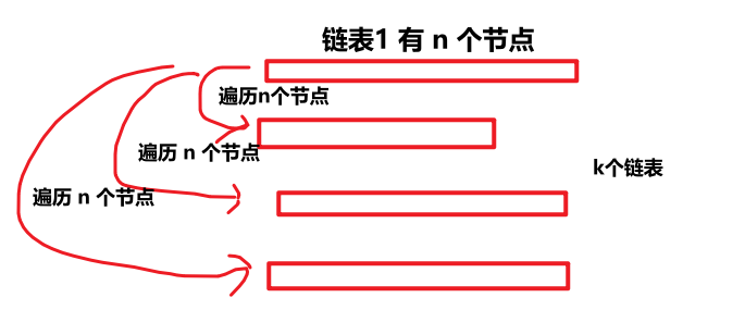 法一,暴力解法:回想两个有序游标合并,合并一次时间复杂度 O(2n)=O(n)。那么第一个链表与后续的 k-1 个链表合并,需要遍历第一个链表 (k-1)n 次节点。那么 k 个链表合并,需要遍历 (k-1)n + (k-2)n + …… + 2n + n = n*k(k-1)/2 = O(n*k^2),相当于 O(n^3) 时间复杂度很高。