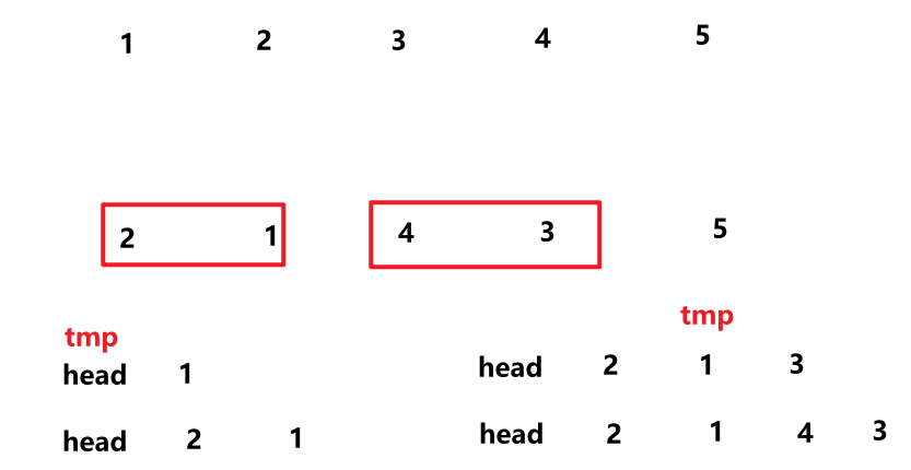 分析:翻转链表,可以想到遍历链表节点,头插到新链表。我们可以分成 length/k 组进行翻转头插,最后 n%k 个不管。每组从 tmp 位置(上一组遍历的第一个节点)开始头插。时间复杂度 O(n),空间:O(1)。