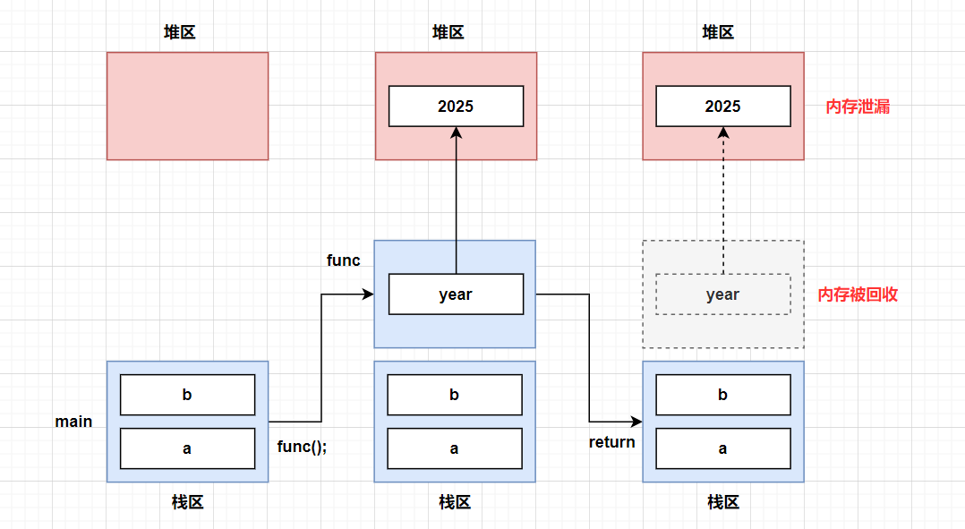 堆区的内存分配,不论是申请还是回收,都是需要用户自己操作的,如果你学过C语言应该深有体会。但是我们并没有回收堆区的数据,等到变量year被销毁,那堆区的2025就永远无法访问了,这块内存后续又用不上,还无法分配给其它变量,这就是典型的内存泄露问题,在C/C++是很常见的错误,后来C++用RAII大幅减缓了这个错误的可能性。
