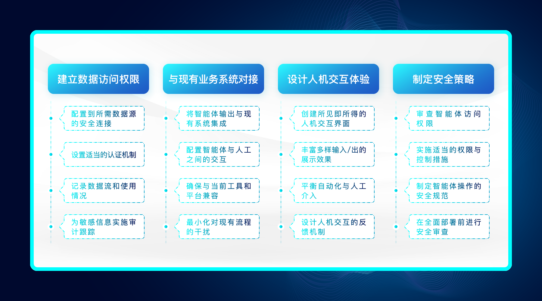 智能体不是“替代人”,而是“辅助人”,因此人机交互体验的设计直接决定了员工对智能体的接受度。集成阶段需从四个维度打磨体验:
