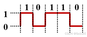 - 不归零制:正电平代表1,负电平代表0,不能从信号波形本身中提取信号时钟频率,无自同步能力。
