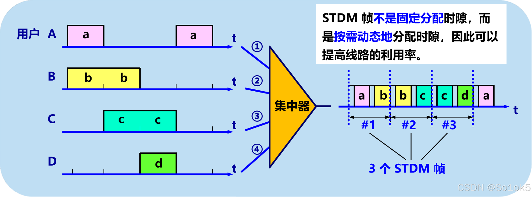 - 定义:STDM帧不是固定分配时隙,而是按需动态地分配时隙。