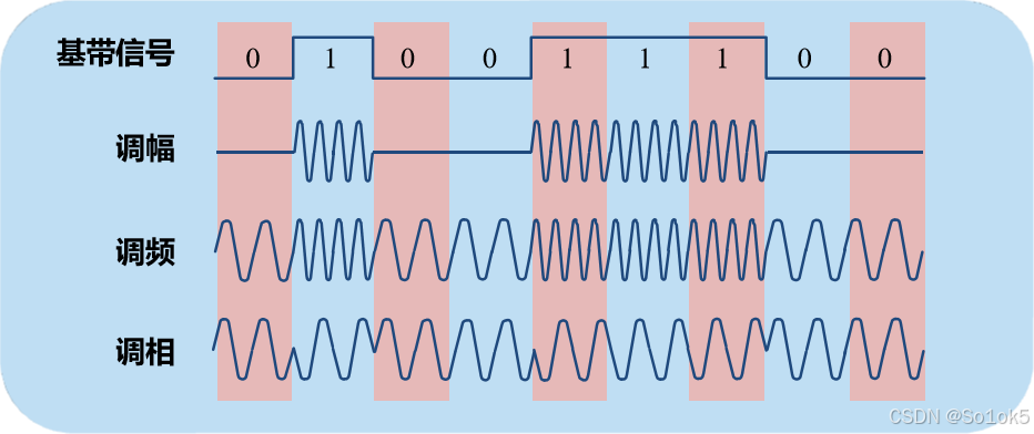 - 调相(PM):载波初始相位随基带数字信号变化。