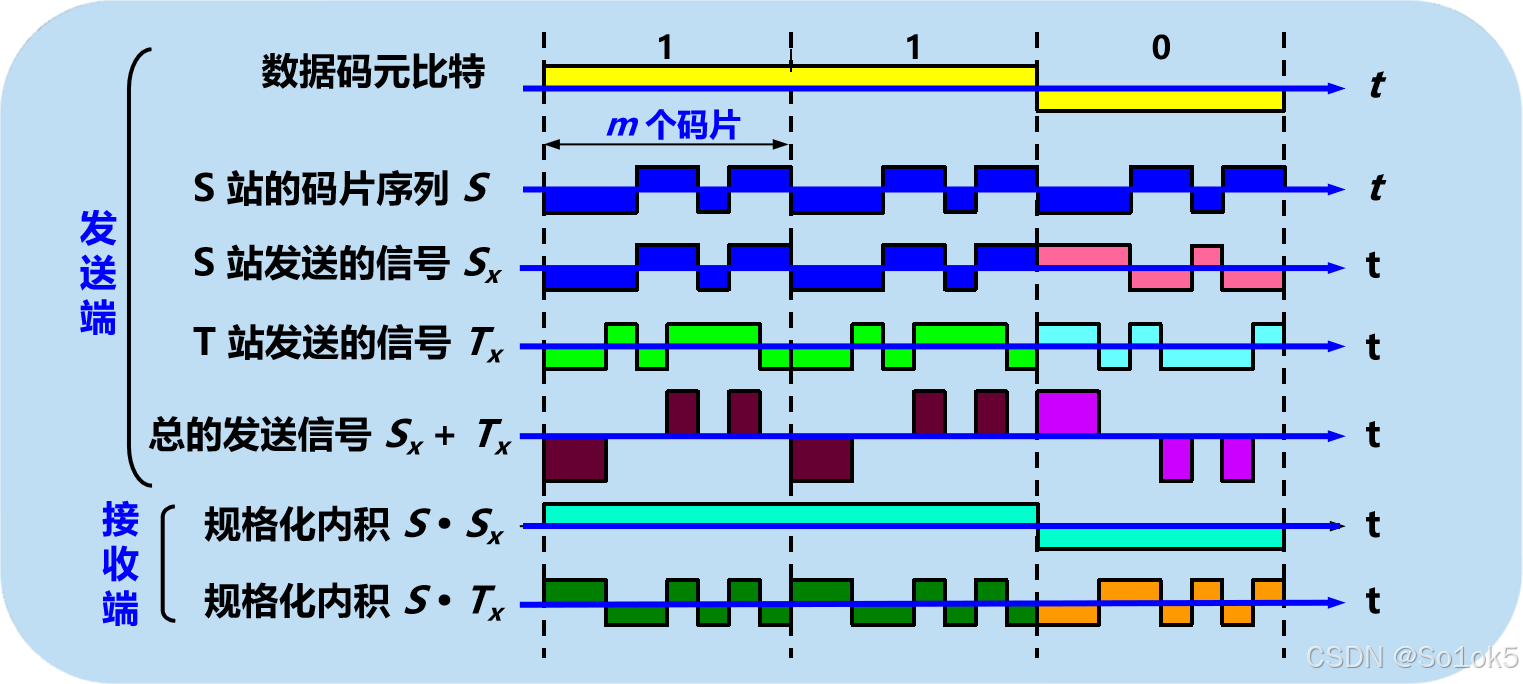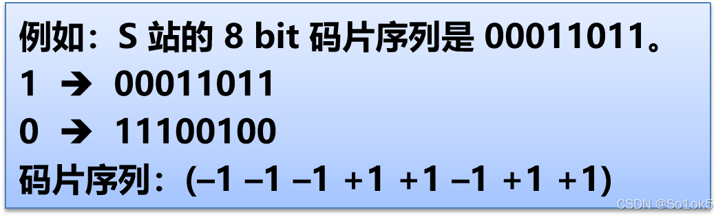 - 码片序列分配:为每个站指派一个唯一的m bit码片序列。