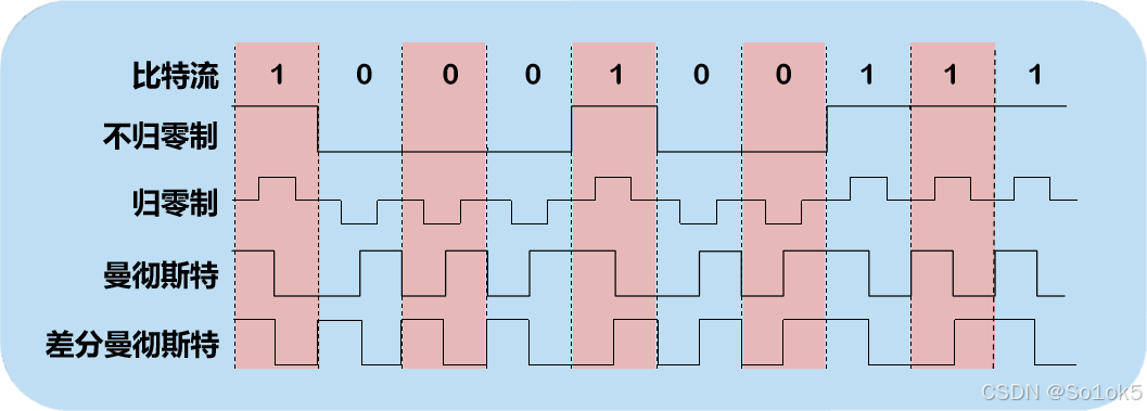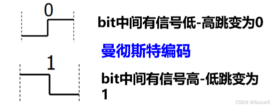 - 位周期中心向上跳变代表0,向下跳变代表1(或相反)。