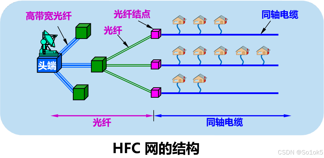 - 基于有线电视网 CATV 网:将原有线电视网中的同轴电缆主干部分改换为光纤。