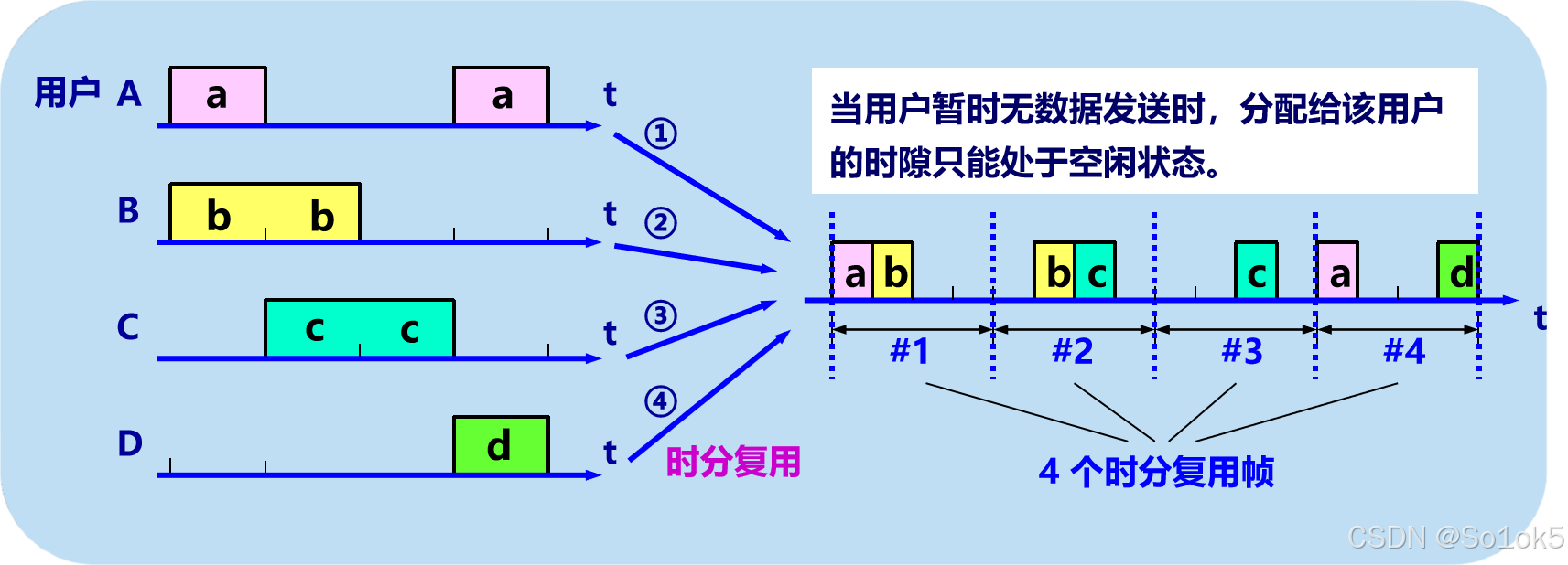 - 问题:时分复用会导致信道利用率不高,当用户暂时无数据发送时,分配给该用户的时隙只能处于空闲状态。