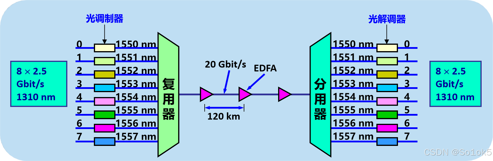 - 组件:复用器、分用器、EDFA(掺铒光纤放大器)、光调制器、光解调器