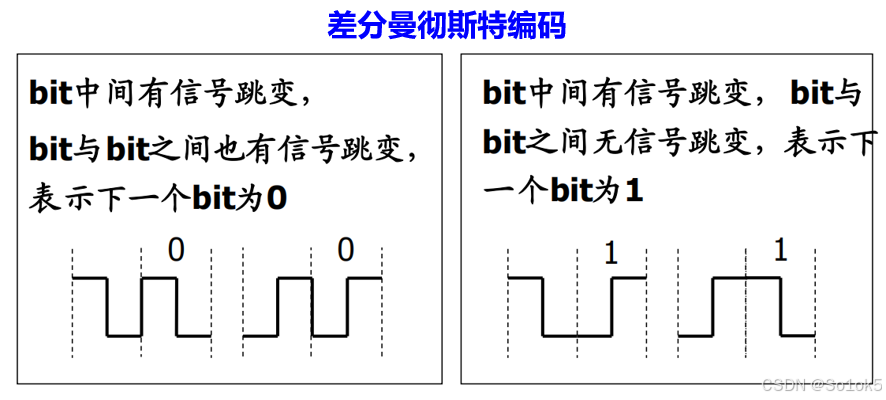 - 差分曼彻斯特编码:每位中心有跳变,位边界跳变代表0,无跳变代表1,具有自同步能力。