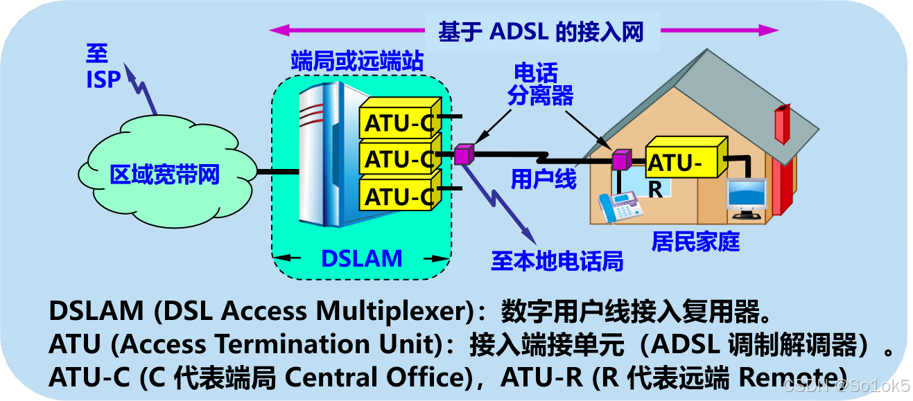 - 数字用户线接入复用器 DSLAM (DSL Access Multiplexer),用户线和用户家中的一些设施。